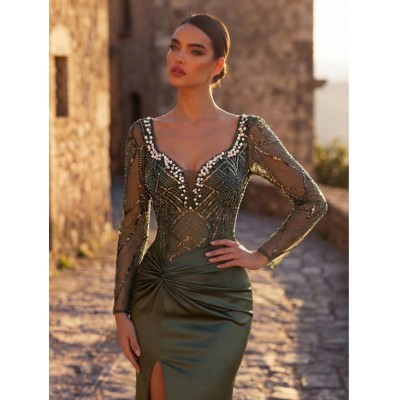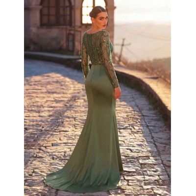 Elitara Elegant Luxurious Pearl Chain Splice Elastic Knit Net Ruched One Shoulder Halter Mermaid Dre